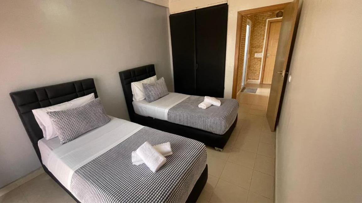 - غرفة نوم: تحتوي على خزانة وأسرّة طويلة (أطول من مترين).